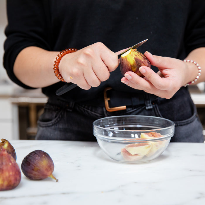 - Peel the figs using a knife, then cut them into halves and set them aside.