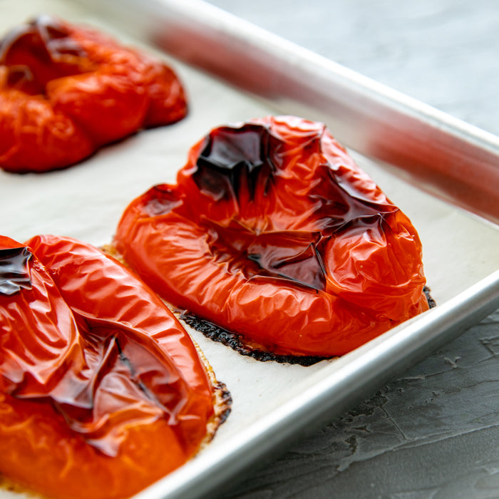 - Cut pepper into two halves, remove seeds, and roast at 400°F degrees for about 30 minutes (or until skin is black and blistered). Let pepper cool on the side.