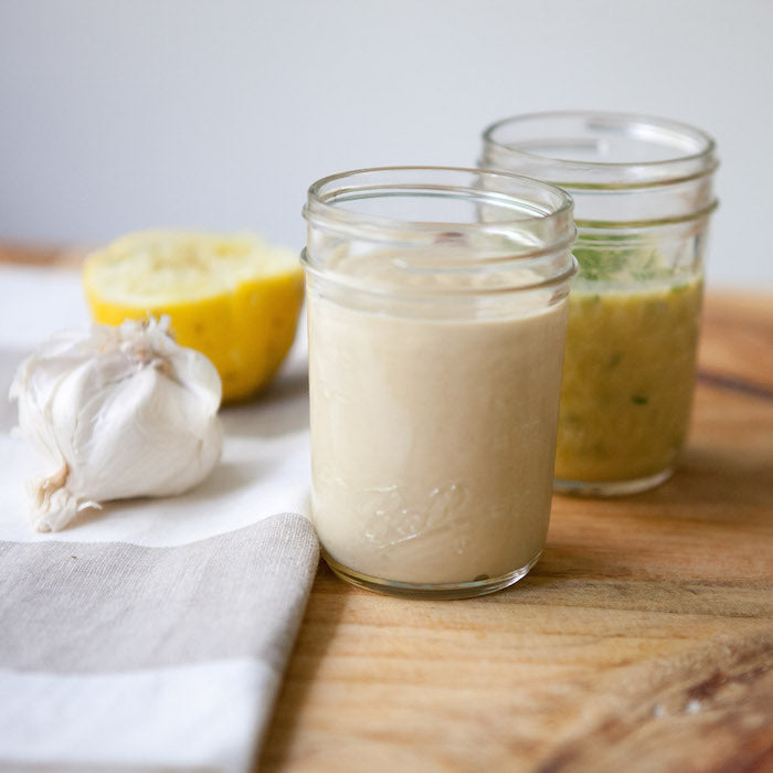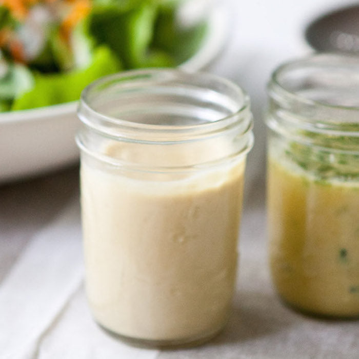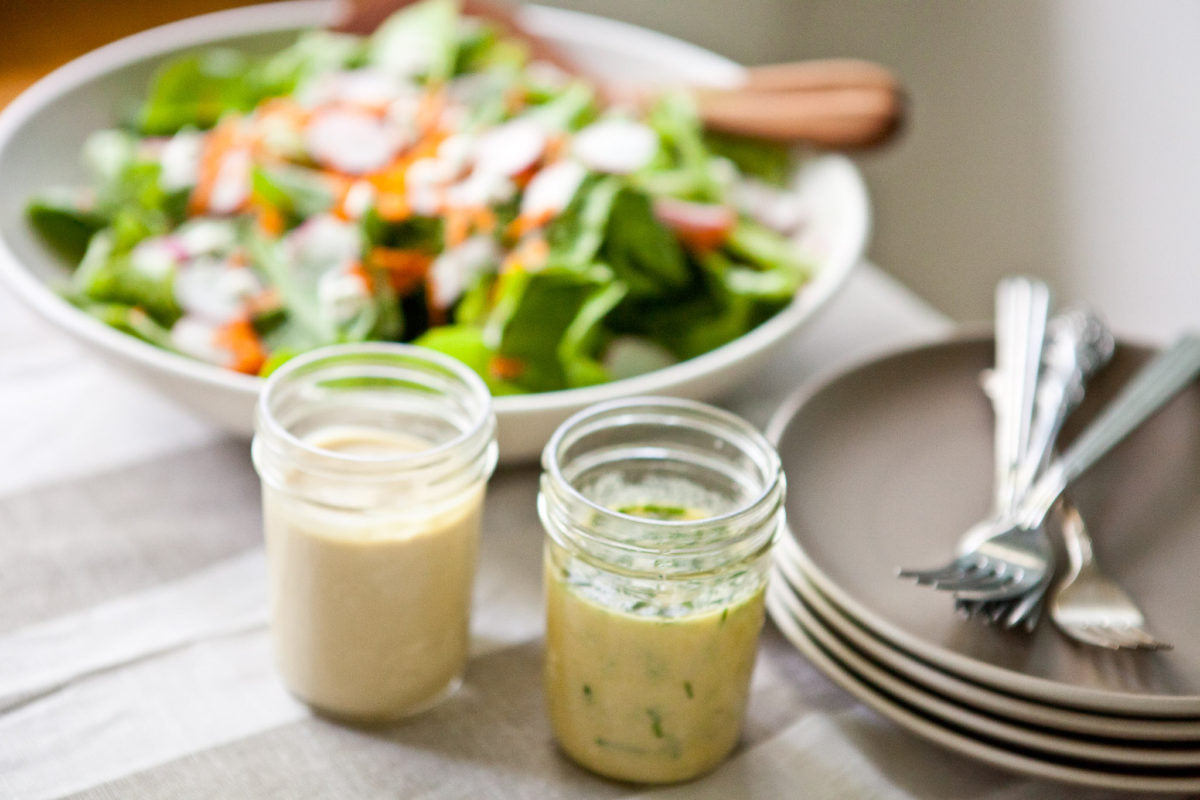 - In a screw-top jar, combine the olive oil, apple cider vinegar, mustard, garlic, herbs and salt.