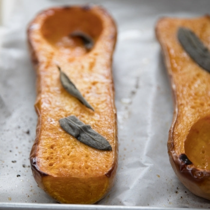 - Bake for 45 minutes until soft when pierced with a fork. When cool enough to touch, remove the sage leaves and scoop the flesh out of the skin. Let cool completely.