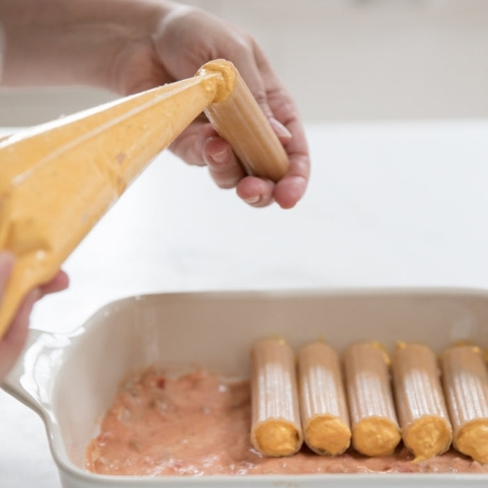 - Assemble the dish: Place half of the sauce in the bottom of a 9 x 13-inch baking dish. Transfer the squash mascarpone filling to a pastry bag. Cut a ½-inch hole in the bag. Pipe the filling in the manicotti, leaving some space at each end of the noodles.