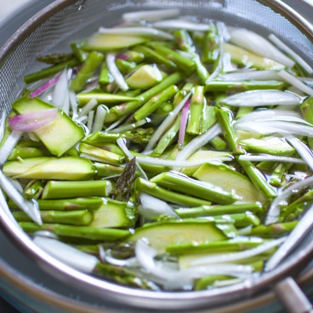 - Soak the asparagus, zucchini and onions in cold water for 5 minutes to remove dirt. Drain well.