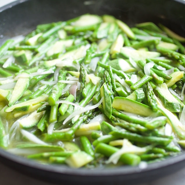 - Ladle some cooking water in the skillet to keep the vegetables moist.
