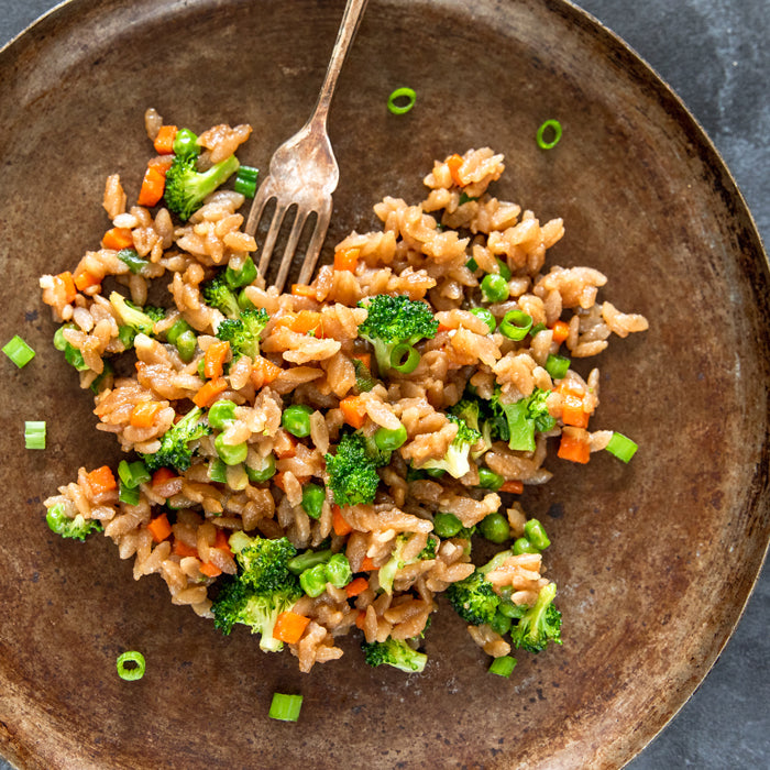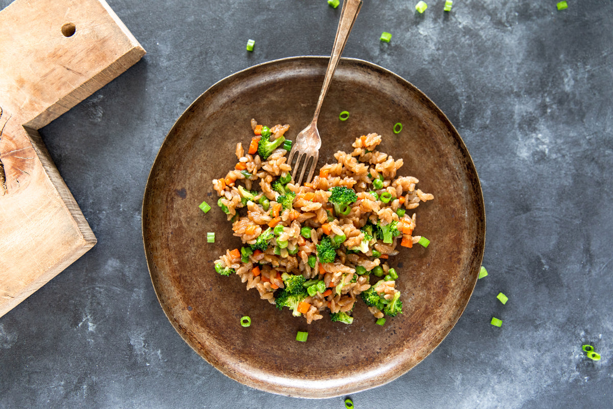 - Heat the olive and sesame oil in large skillet on medium heat for 30 seconds. Add broccoli, carrots, peas, and garlic and stir fry for 2 minutes.