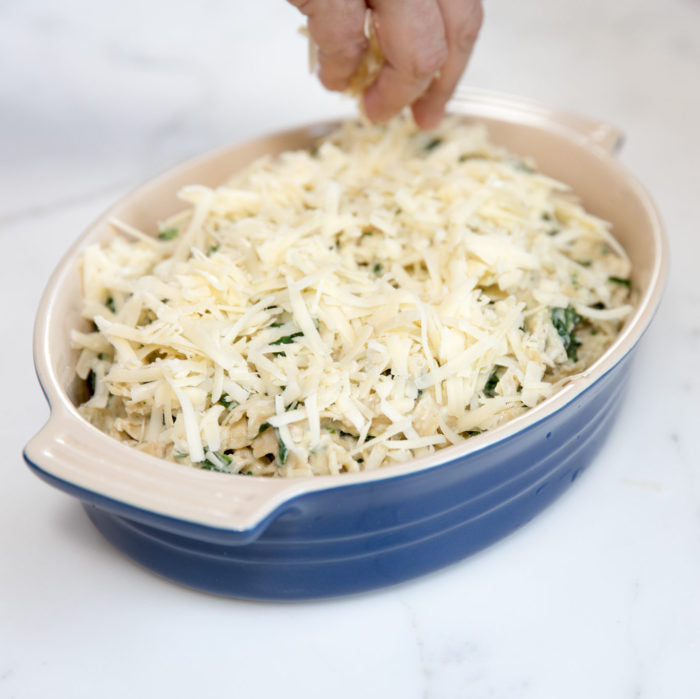 - Butter a 3½-quart baking dish. Evenly layer the pasta in the dish and top with cheddar cheese.