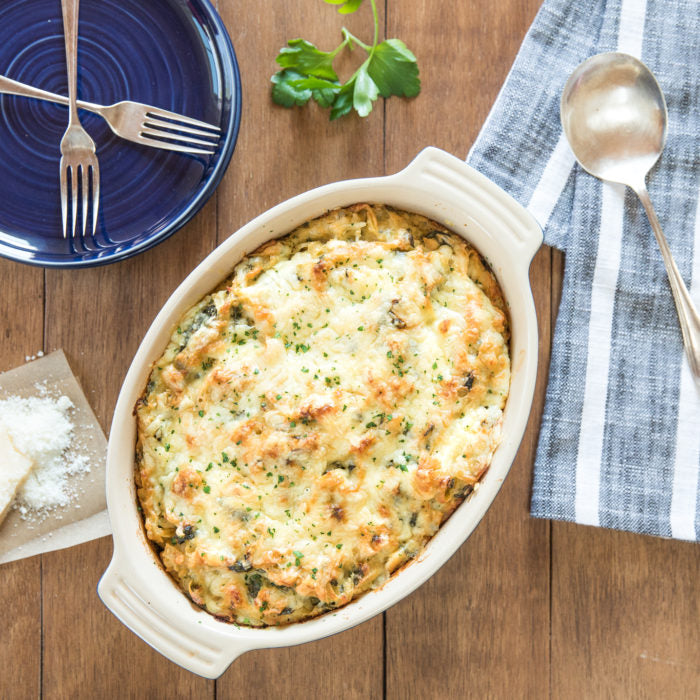 - Cover the dish with aluminum foil and bake for 15 minutes. Uncover and bake for an additional 5 minutes until the cheese has lightly browned.