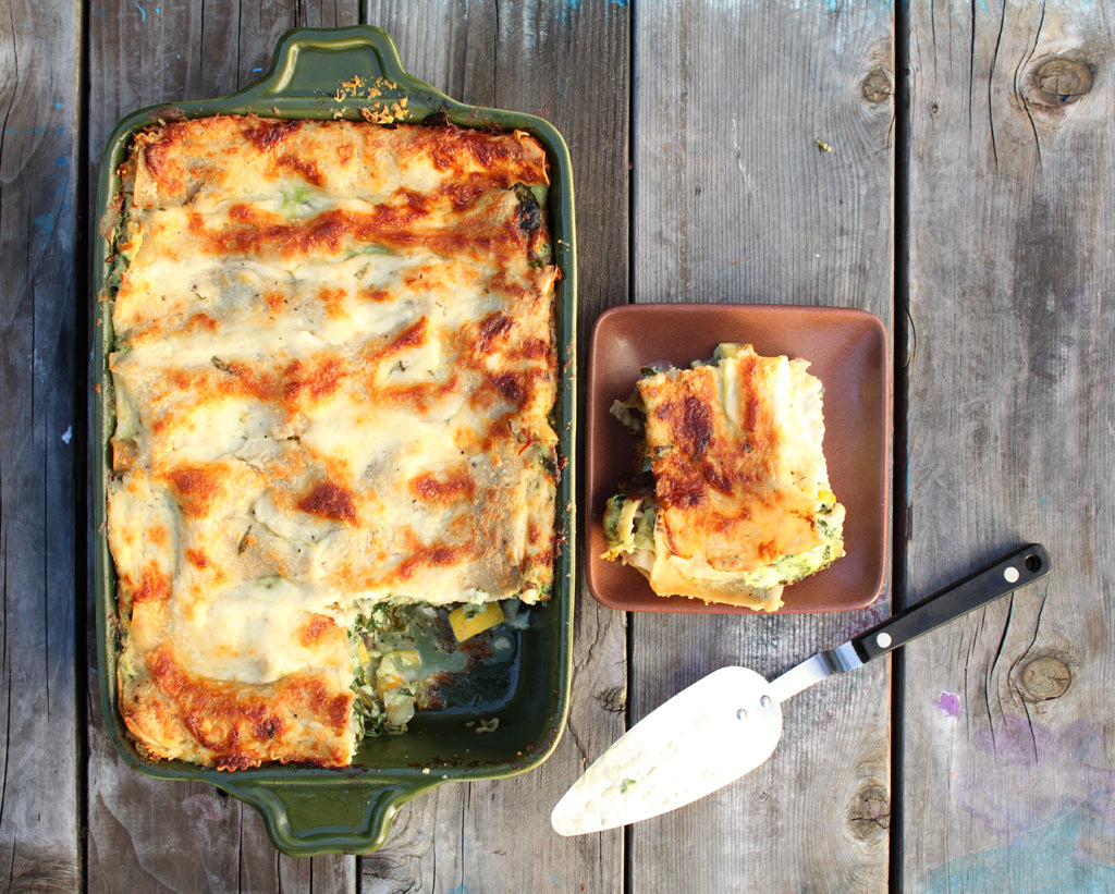 - Spread ¼ of remaining Alfredo sauce over the noodles then spread a third of the ricotta mixture, followed by a third of the cooked vegetables and then a third of the Pecorino Romano cheese mixture.