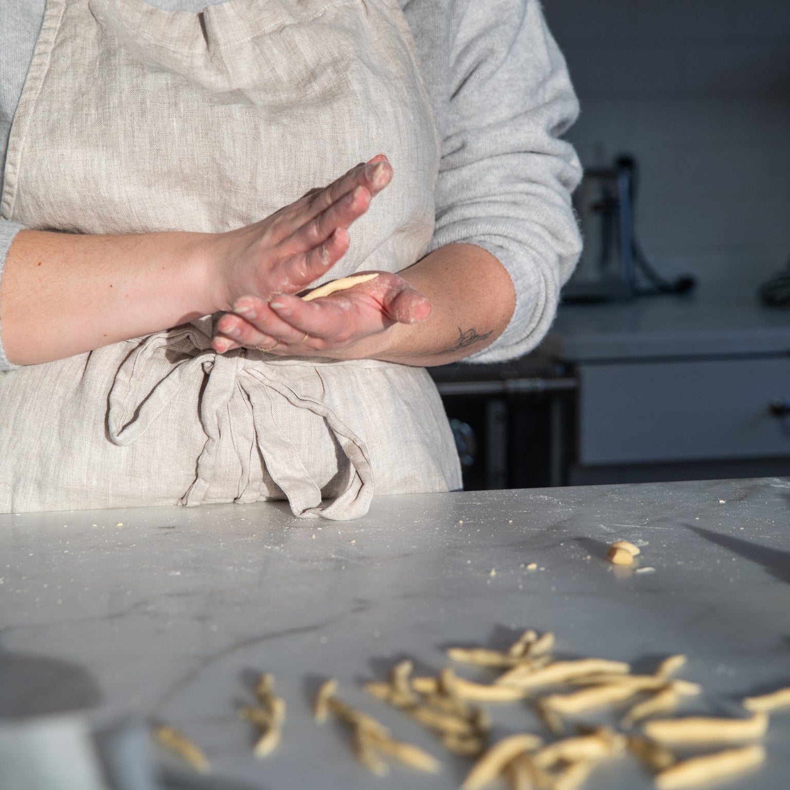 - To make trofie: cut off a small section of dough, then roll into a long rope about ½-inch in diameter. Cut into ½-inch bits, then begin shaping the trofie. To do so, place the dough between your hands in the lower part of your palm. Roll the dough off of your hand by moving your dominant hand in forward motion, while pressing down. It might take two rolls to get a good shape. The finished pasta should be tapered thin on both ends and thicker and slightly curled/irregular in the middle section.