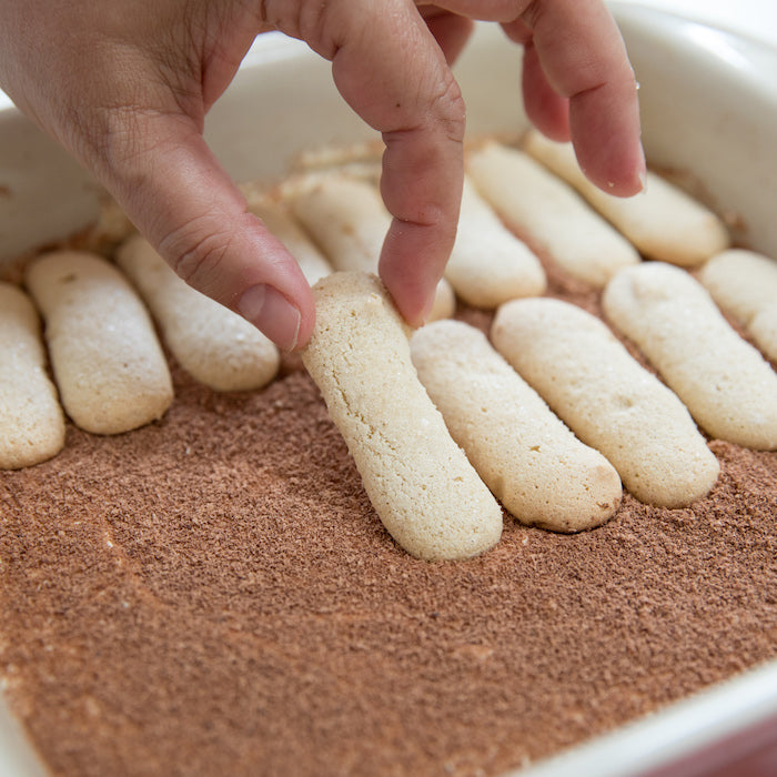 - Assemble the cake: Place the espresso in a bowl. Using a third of the ladyfingers, dip each one in the coffee, then flip to lightly coat both sides. Arrange them in the bottom of a 9 x 9-inch square baking dish.