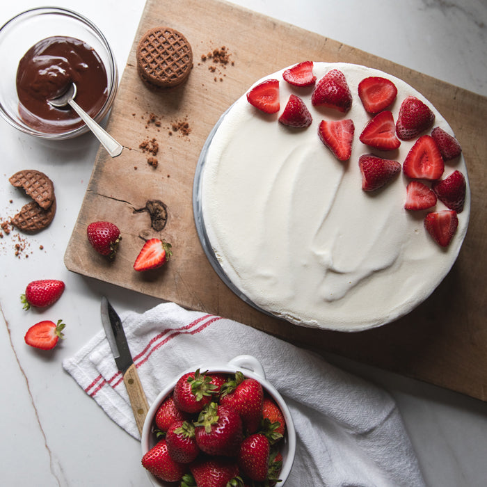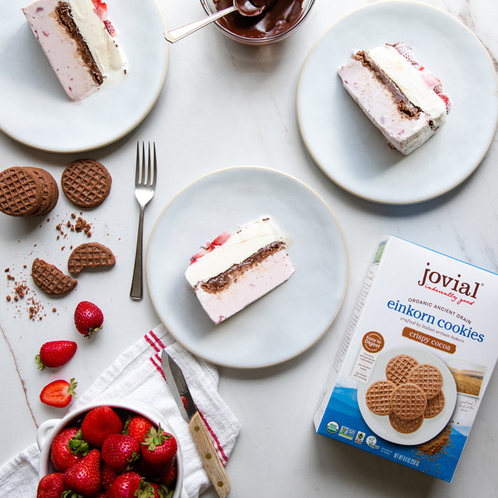 Years ago our Connecticut test kitchen came across an ice cream cake recipe that used our Einkorn Crispy Cocoa Cookies in its fudgy filling. We tried the recipe and it soon became a popular request by our employees for their birthdays! This recipe is a twist on the original version by Gather Dine, incorporating fresh strawberries with strawberry and vanilla ice cream. However, you could easily make this cake with any combination of ice cream flavors (We also strongly recommend coffee and chocolate ice cream)! Either way, this recipe is one of our personal favorites and we’re so excited to finally share it with you.