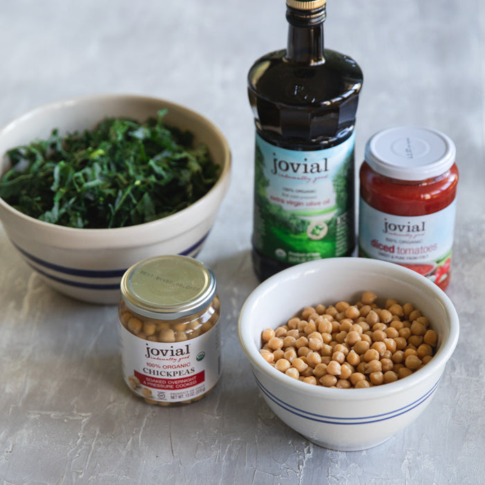 - Add the chickpeas, oregano, red chili flakes and salt and stir to combine. Add the tomatoes and broth and bring to a low boil over medium-high heat.
