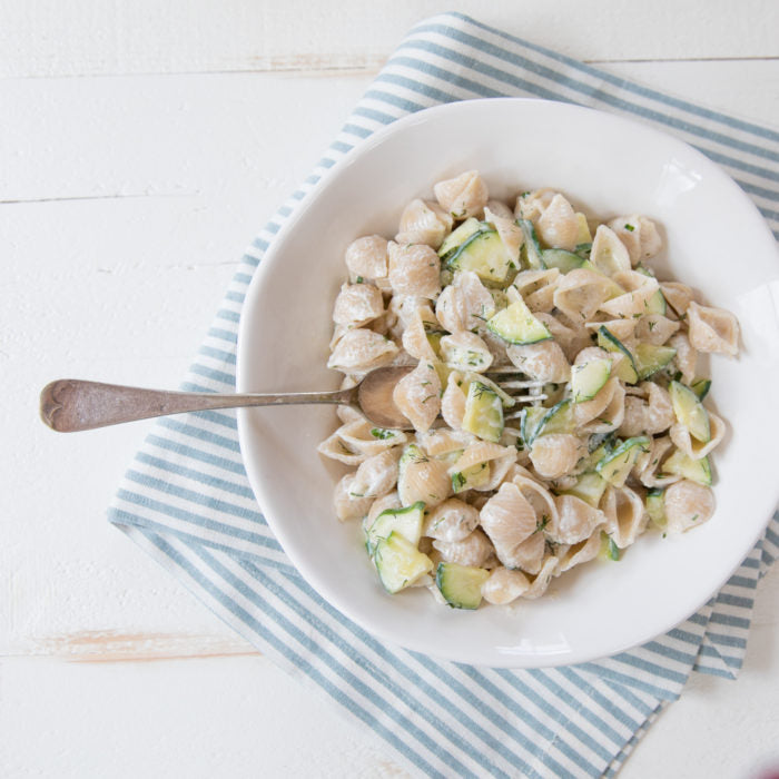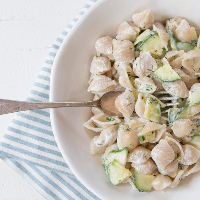 - In a large skillet, stir-fry the zucchini on medium-high heat in 1 tablespoon of olive oil for 1 minute. Transfer zucchini to a large serving dish.