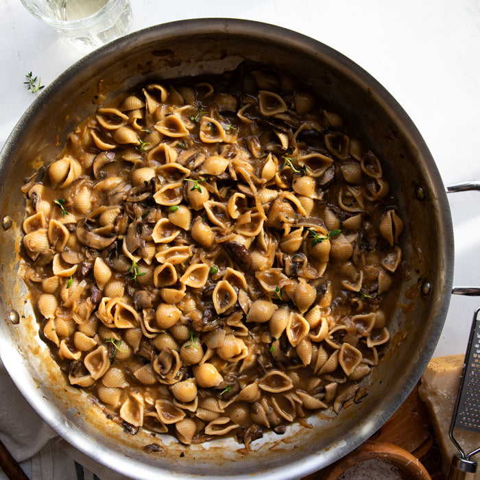 This weeknight pasta dish comes together in one pan and celebrates the bold flavors of French Onion Soup—made a touch lighter with the addition of Parmesan cheese instead of Gruyère. The trick here is to use the biggest pan you have, and to let the onions take their time to truly caramelize – you’ll thank yourself for spending the extra time when you take your first bite.