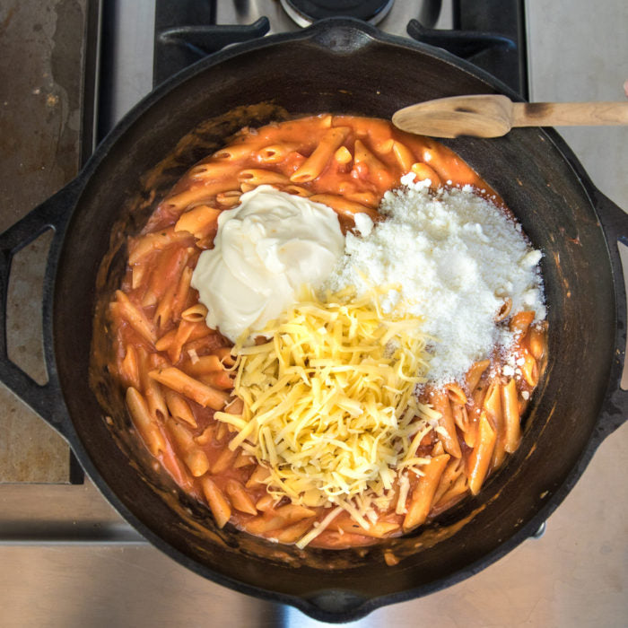 - Turn off the heat and gently stir in the cheeses until the sauce becomes creamy.