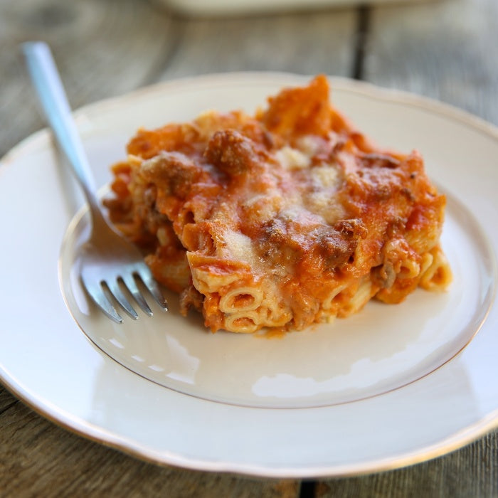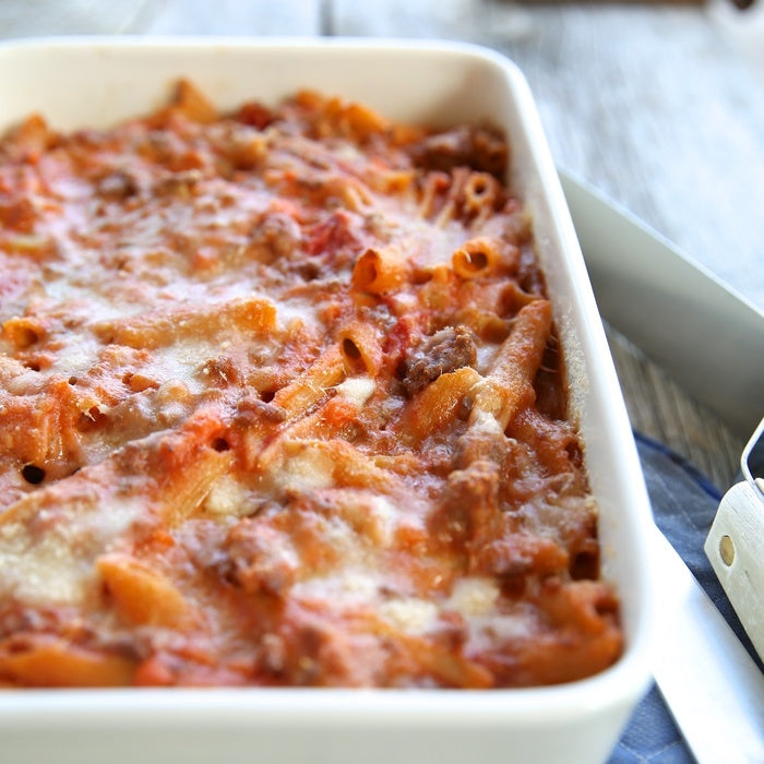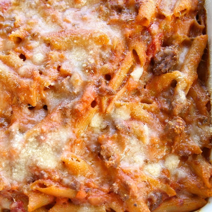 - Butter a 9 x 13-inch baking dish. Transfer the pasta to the dish and top with the remaining ¼ cup Parmigiano.
