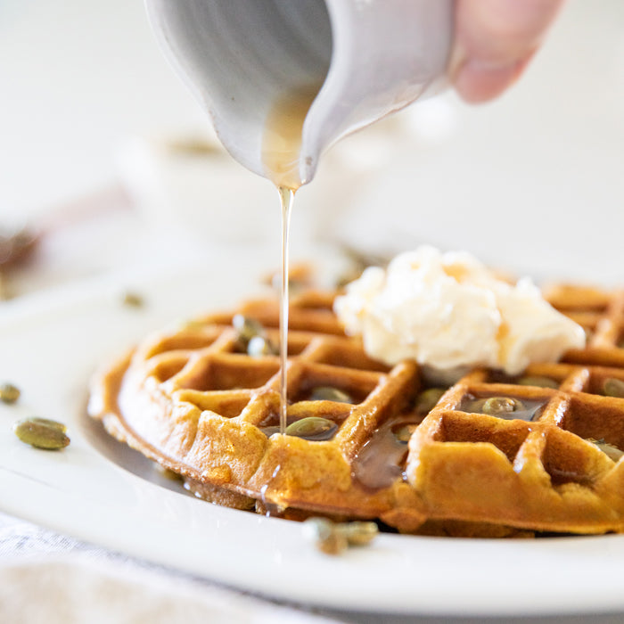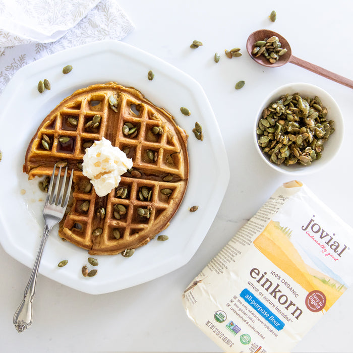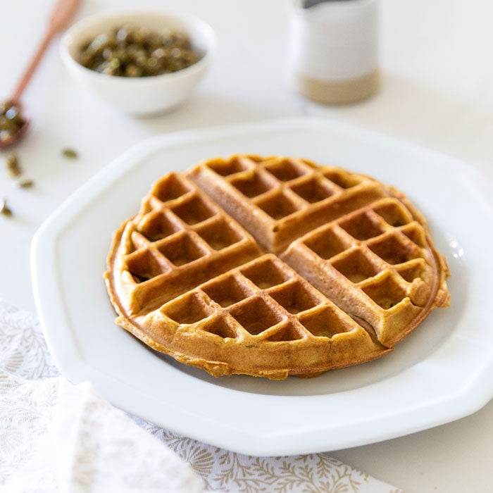 Homemade einkorn waffles are a special treat for weekends and holidays, and kids and adults alike will fall for this autumn-spiced version. The candied pepitas are a cinch to pull together—they’ll be in large clumps straight out of the pan, but you can break them up easily to top your waffles.