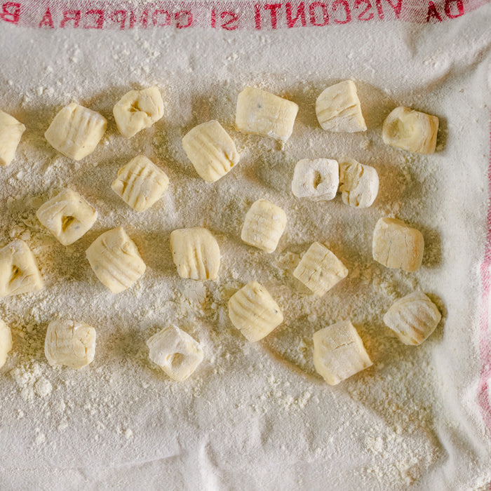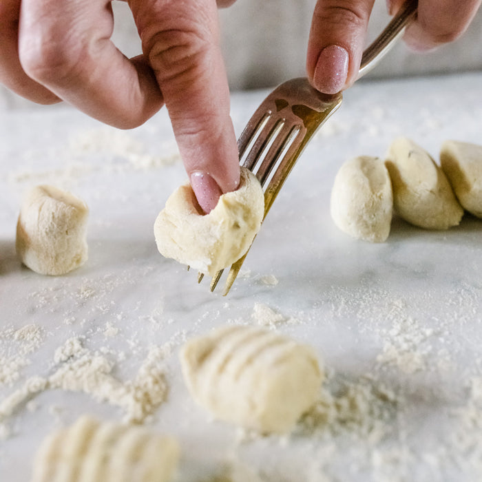 - Working with one quarter at a time, use your hands to roll the dough into a long rope until it’s ½" thick. Use a knife to cut the rope into ½" pieces. Working with one piece at a time, roll the dough piece up the back of fork tines, which will create small ridges on one side of the gnocchi, while your pointer finger will create a small indent on the opposite side. Continue to roll each gnocchi up the fork and place in a single layer on a floured, linen towel.