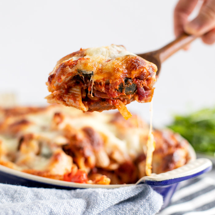 Recipe by Katie Farina. This vegetable-loaded pasta bake is the perfect comfort food for a cozy night in and makes for great leftovers. Feel free to swap the homemade marinara with a store-bought one to save time. You can also use any vegetables you like!