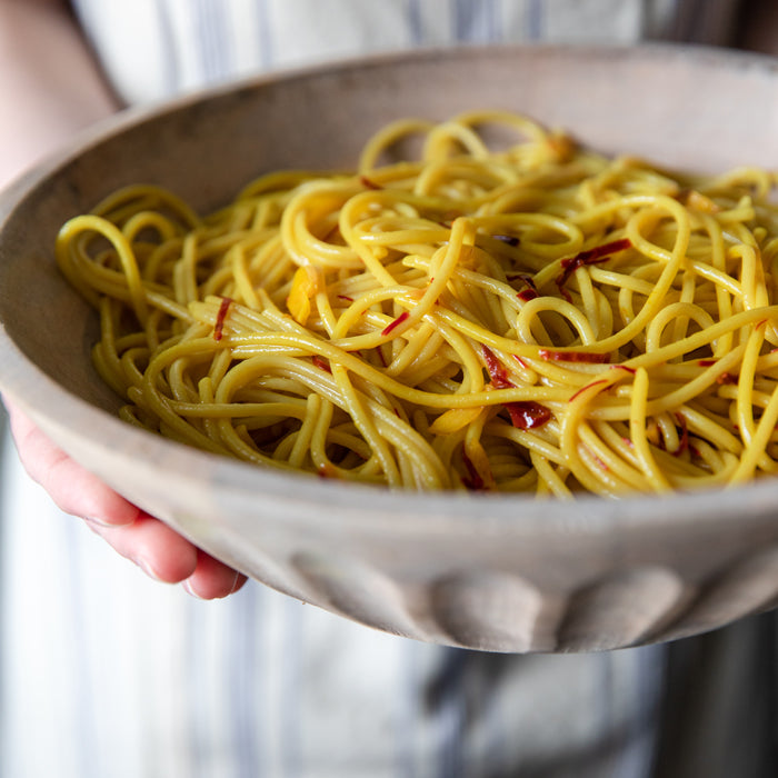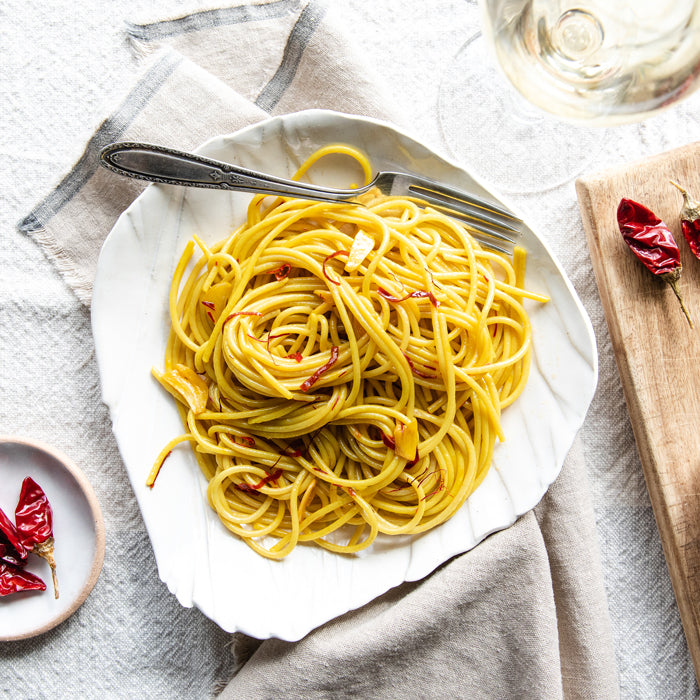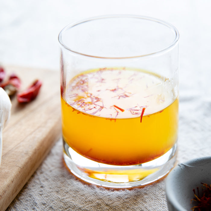 - While the oil cools, dissolve the saffron in the pasta water that was saved and let rest for about a minute.
