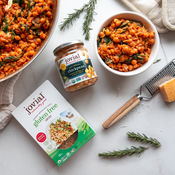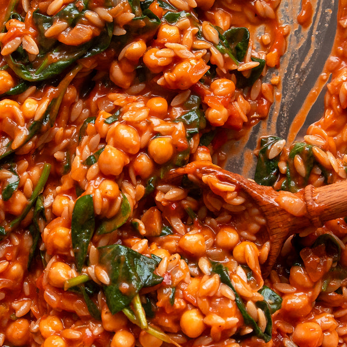 A truly simple one-pot meal that’s full of saucy tomato flavor, tender chickpeas and brown rice orzo with just enough Parmigiano Reggiano to bring it together. Fold in spinach or chopped kale if you’re looking for extra greens. Store in an airtight container in the refrigerator for up to four days. If you’d prefer less heat, use only ¼ teaspoon red pepper flakes, or omit altogether. You can also leave out the Parmigiano Reggiano for a delicious vegan option!