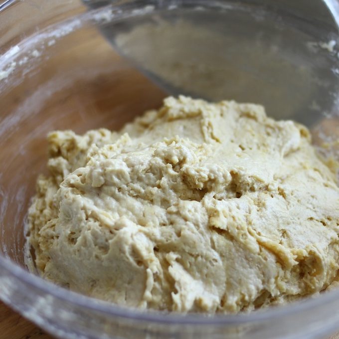 - Mix until the flour is absorbed by the liquid. The dough will be very wet and very sticky, but do not add flour. Cover the bowl with plastic wrap and let rise for 45 minutes.