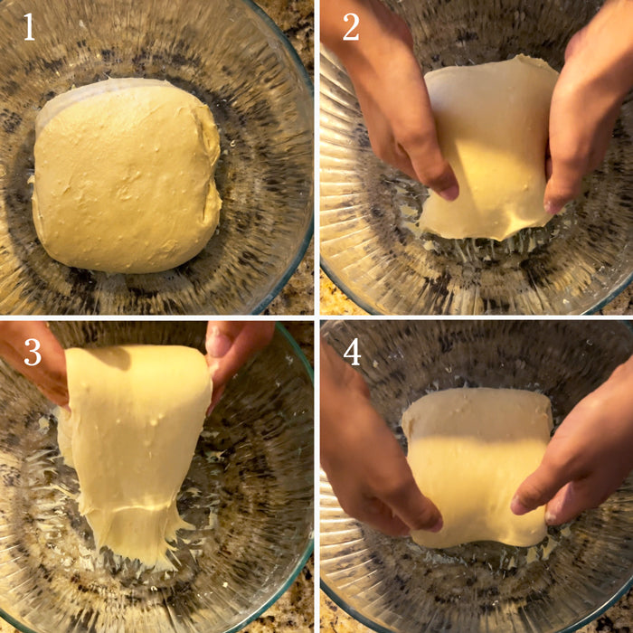 - After the 30 minutes, perform a coil fold (see notes below) then rest again for 30 minutes. Repeat 2 more times for a total of 3 coil folds. Cover the bowl after the last coil fold and continue to ferment in a warm area for another 3.5-4 hours.