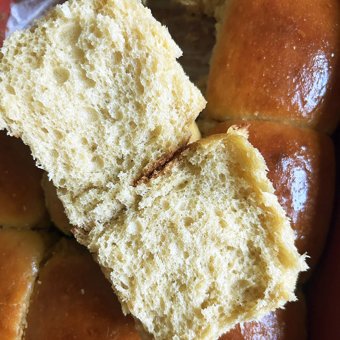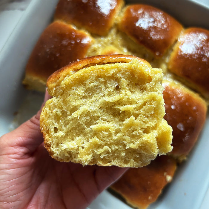 These soft, buttery sourdough rolls are sweeter than a regular dinner roll, with a hint of pineapple flavor. What really stuns us, however, is their texture. By using the Tangzhong method (whisking flour and milk together over heat), this recipe pushes the boundaries of einkorn’s softness—these are as fluffy as it gets with einkorn! They’re best eaten when warm, the same day, right after they’re brushed with the pineapple honey butter. We also love using these for sandwiches or sliders! Store leftover rolls in a sealed bag at room temperature for a few days. They can also be frozen, just try adding some moisture to them when reheating.