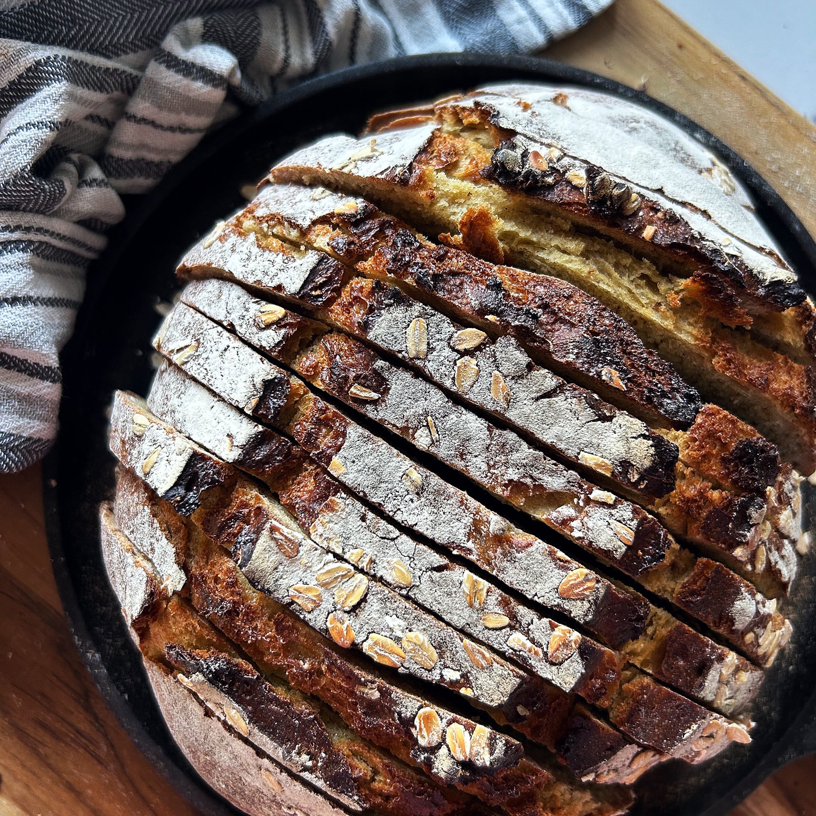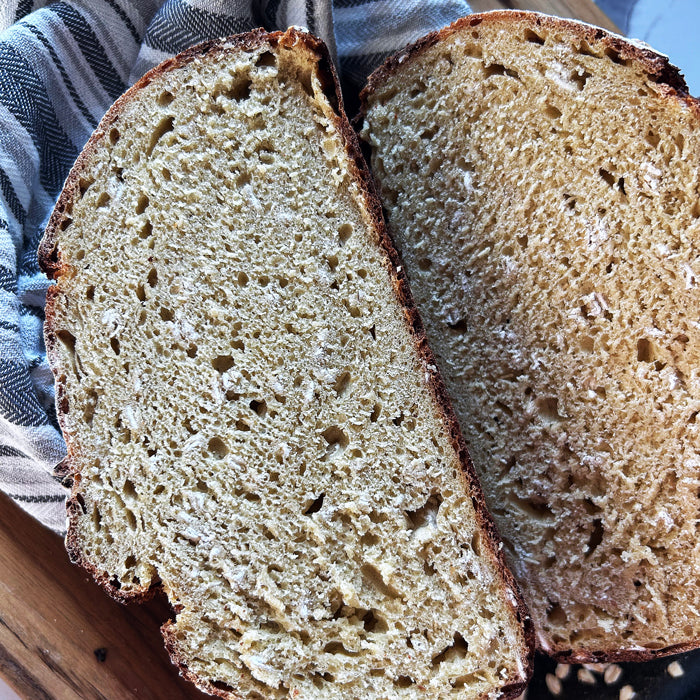 Recipe by Kerenza De Freitas. A touch of honey brings a gentle sweetness and added depth to this sourdough boule, perfectly complementing the warm, nutty flavors of einkorn. This recipe uses a stiff starter for a higher rise and a fluffier crumb. We’ve provided options for either an overnight or an all-day fermentation schedule to help you time out this recipe, but be sure to keep an eye on your dough’s progress to guide you—it should be puffy with a domed center and small bubbles or holes just before it’s ready for shaping.