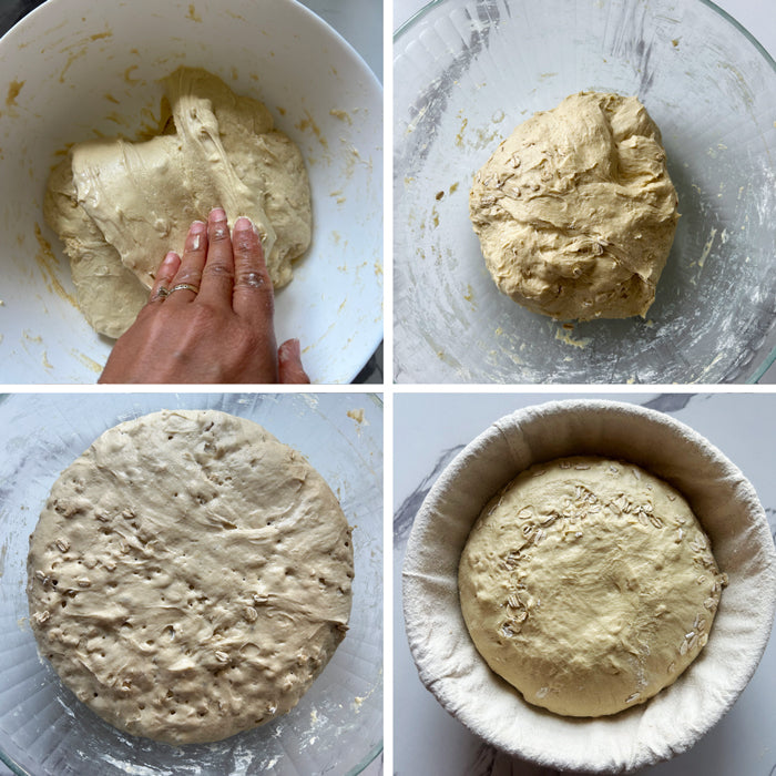 - In a large bowl, combine 100 g (¼ cup plus 1 tablespoon) of the stiff sourdough starter, water, and honey. Add the flour, salt, and oats. Mix with a dough whisk or fork until you can’t mix anymore. Continue to mix with your hands until a shaggy dough forms. Cover and let rest for 30-45 minutes.
