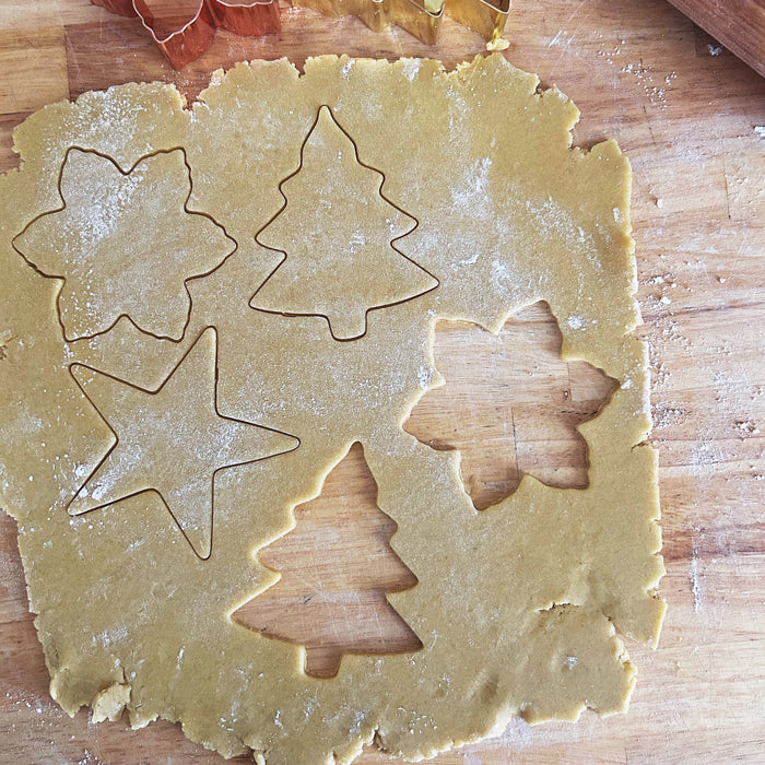 - When ready to bake, preheat the oven to 350° F. Flour your work surface and roll the dough out to about ½” - ¾” inch thickness. Dust with flour as you roll to prevent the dough from sticking. Cut into desired shapes. Freeze any dough that gets too soft then roll out again.