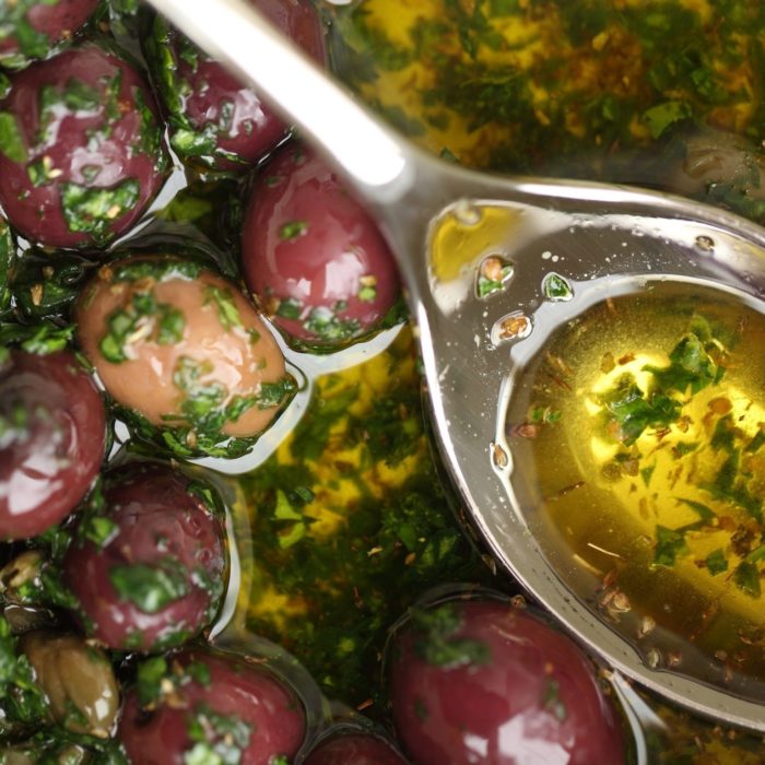 - In a small mixing bowl, whisk 2 tbsp. of olive oil, capers, olives, oregano, parsley & basil together, then add to sauce but do not cook.