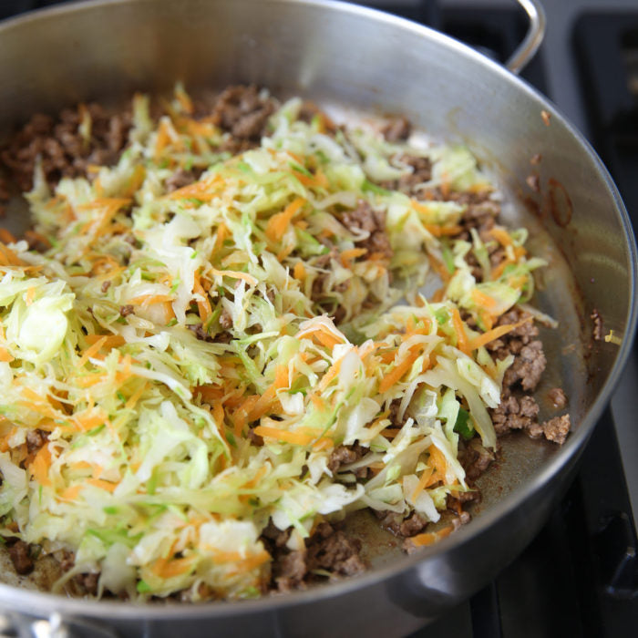 - While the pasta is cooking, place the skillet back on the burner on medium heat, add the remaining tablespoon of sunflower oil and the meat. Cook on medium heat for 2-3 minutes until cooked through, stirring constantly, adding pasta cooking water if the meat begins to burn.