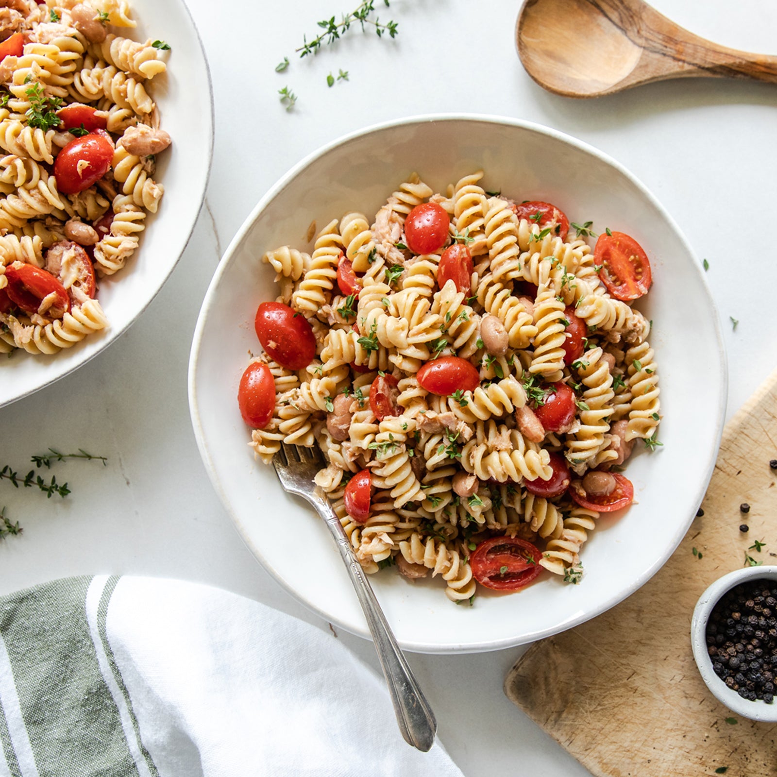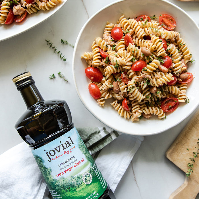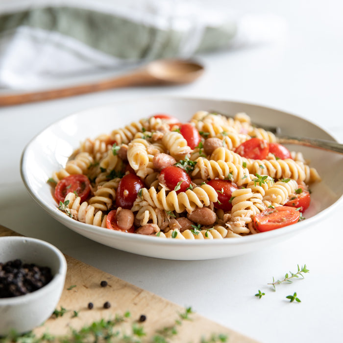 This Borlotti Bean and Tuna Pasta Salad is an effortlessly simple recipe that's nutritious as well as comforting. After draining your pasta, simply toss in juicy cherry tomatoes and salty tuna with our organic Borlotti Beans and flavorful Extra Virgin Olive Oil. Finish it off with Bionaturae Balsamic Vinegar and fresh thyme for a tasty lunch or dinner in a snap. We used our ancient grain Einkorn Fusilli for extra flavor, nutrition, and fuel, but this recipe will be fabulous with your favorite kind of Jovial Fusilli shape!