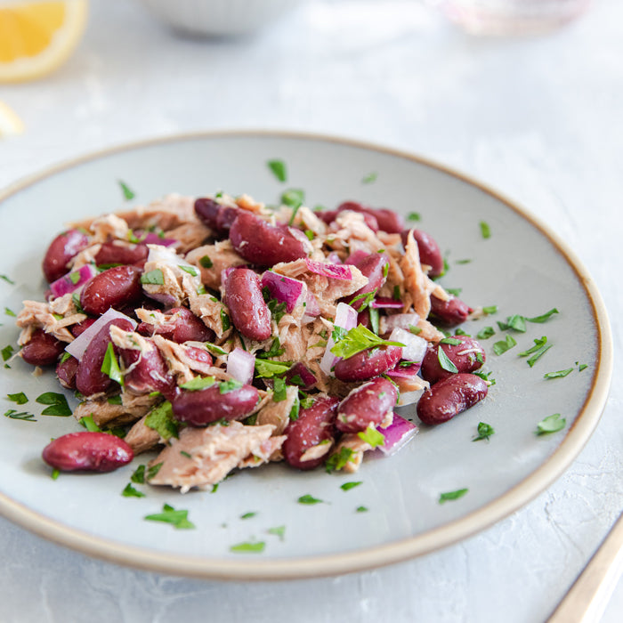 - Drain the oil from the tuna and place in a medium serving bowl. Add the beans and stir to combine.