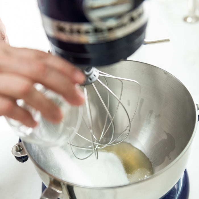 - In a standing mixer, fitted with a wire whip attachment, add the aquafaba and process on medium speed for 30 seconds until foamy. Add the sugar, and cream of tartar and beat on high speed for 5 minutes until the mixture forms soft stiff peaks.
