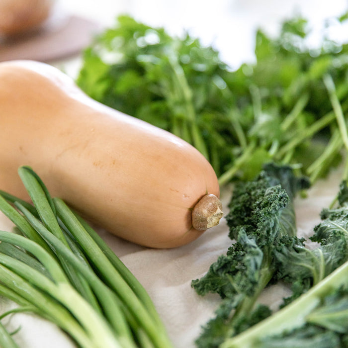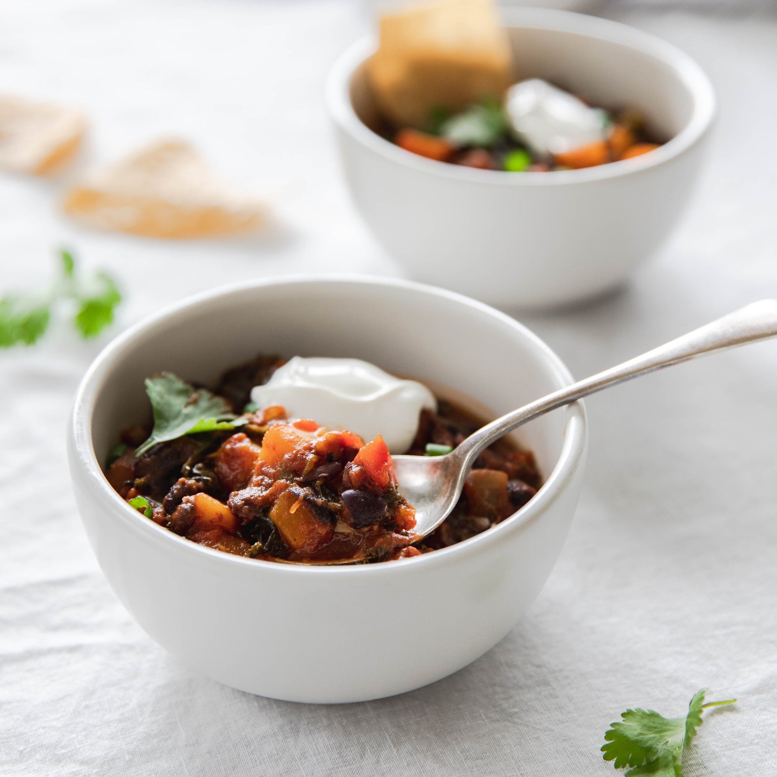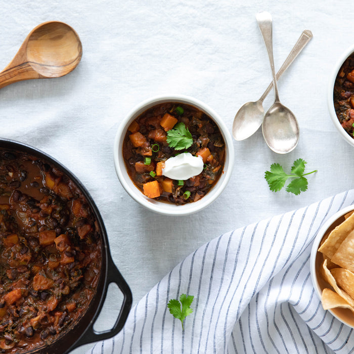A vegetarian chili that is hearty enough to satisfy meat eaters? It is possible with this protein-packed main dish, that reheats well and boasts extra color thanks to the addition of butternut squash and kale ribbons. Serve with green onions, cilantro, a dollop of sour cream, and a few tortilla chips for extra crunch.