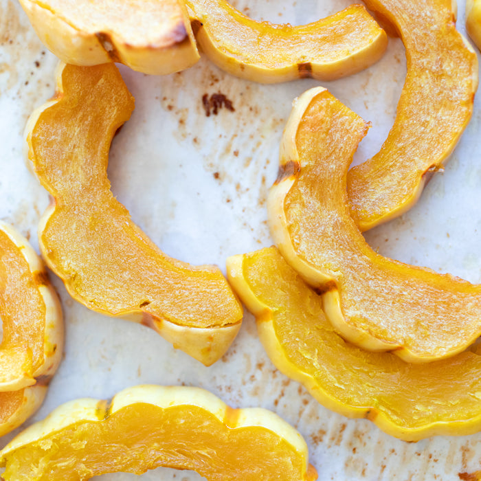 If you’re starting with raw pepitas, you can roast them right alongside your squash: Prepare a second baking sheet with parchment paper. Spread the raw pepitas out evenly and sprinkle with a pinch of salt. Add them to the oven at 425° F for 7 minutes, shaking the tray halfway, until they’re beginning to brown. Watch them carefully!