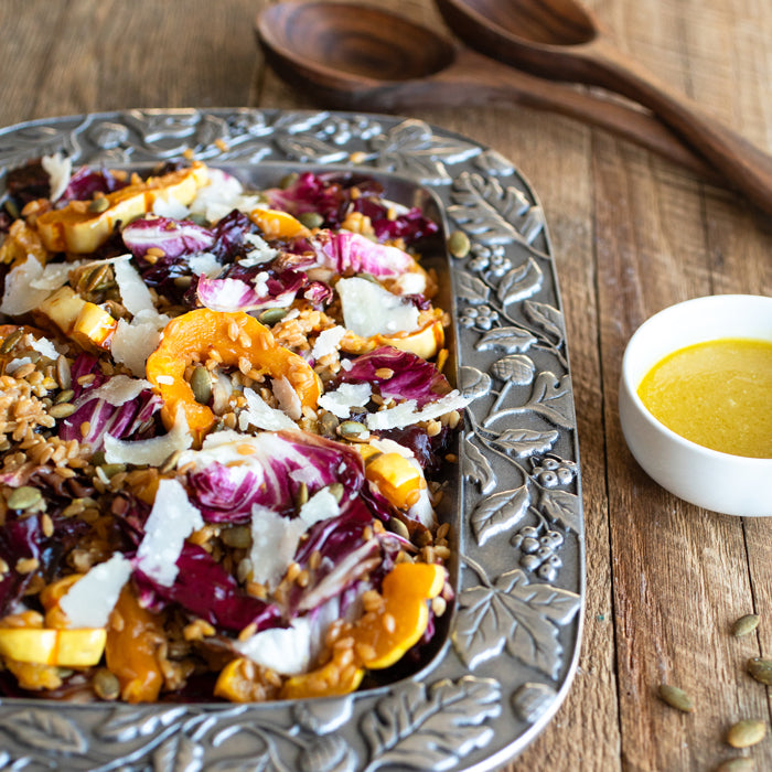 This vibrant fall salad joins tender wheat berries, caramelized roasted delicata squash, and wilted radicchio with a maple miso dressing. A contender for the holiday table, or a nice way to mix up the autumn weekday dinner rotation. If you don’t have roasted pepitas, you can roast raw pepitas along with your squash (see instructions in the notes below). Pecans or sunflower seeds would work well here, too. This salad is best eaten right away at room temperature, but leftovers are also delicious served warm.